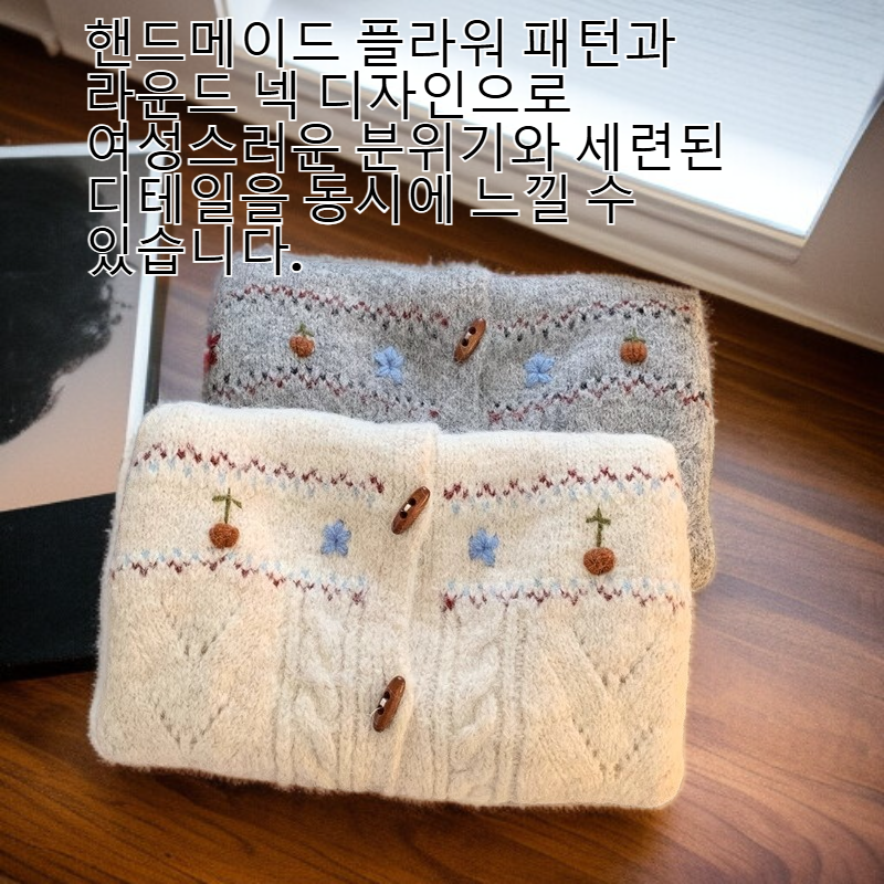● 핸드메이드 플라워 패턴과 라운드 넥 디자인으로 여성스러운 분위기와 세련된 디테일을 동시에 느낄 수 있습니다.